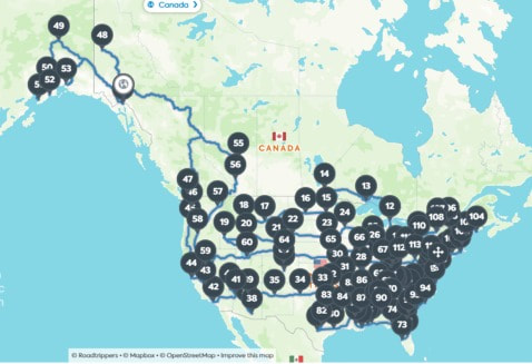 Continuing into a north central loop, we will go thru Mackinaw City MI, Thunder Bay Ontario, Winnipeg Manitoba, Fargo ND, Bismarck ND, Billings MT, Butte MT, Boise ID, Idaho Falls ID, Casper WY, Rapid City SD, Sioux Falls SD, Minneapolis MN, Milwaukee WI, Chicago IL.