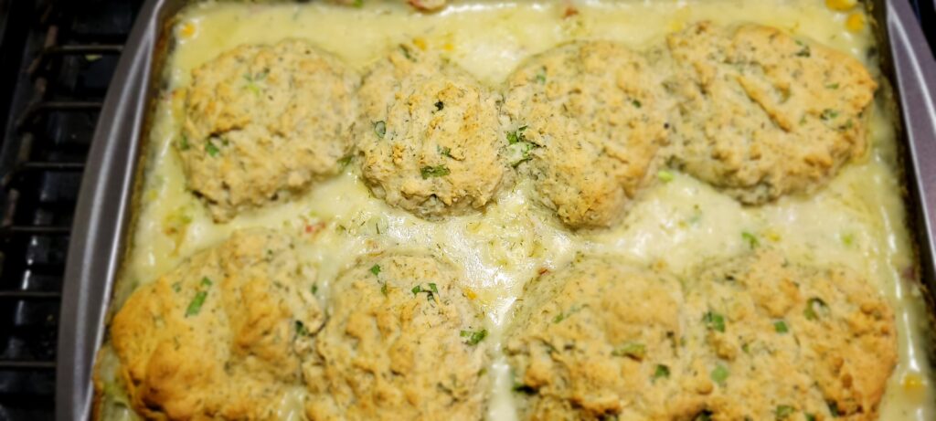 9. Pour the chowder into the prepared baking dish. Drop biscuit dough by large spoonfuls (about 8) over the top.
